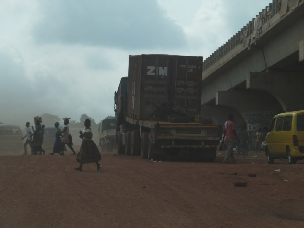 This photo was taken on the main highway in Ghana. Note the broken down vehicle blocking the view of the children sitting on the side of the road and the overloaded vehicles.